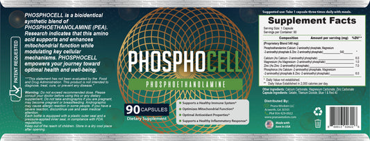 PHOSPHOCELL is a next-generation cellular health supplement featuring 540 mg of bioidentical form of Phosphoethanolamine (PEA)—a critical molecule shown to support mitochondrial function and enhance vital cellular processes.